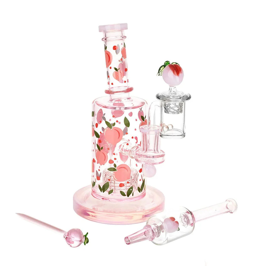 This peachy series from Pulsar includes a 8" tall dab rig with peach decals and glow in the dark accents, a matrix percolator, a matching dab straw, peach dab tool and carb cab, 14mm quartz banger, and two terp beads. Yum!
