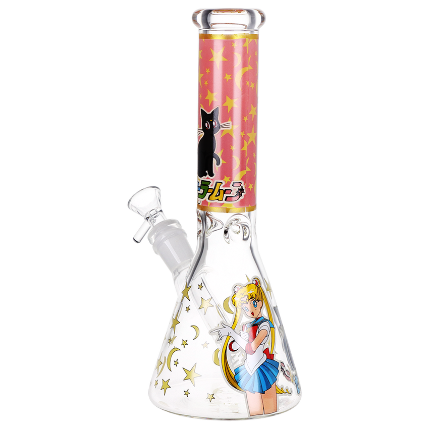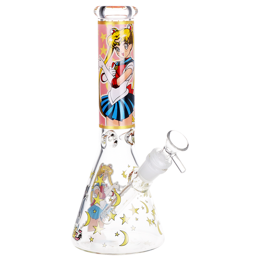 This Sailor Moon Glass Beaker Water Pipe is made with clear borosilicate glass and decorated with glow in the dark decal designs depicting Sailor Moon and Luna. The pipe includes a removable slitted diffuser downstem for water filtration and a 14mm male herb slide with a handle. Measures 10 inches (25.7cm) tall.